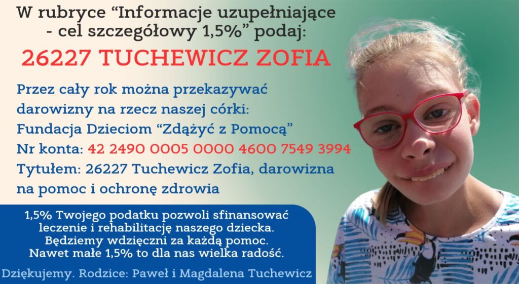 Zosia jest córką Trenera Pawła Tuchewicza , Prosimy o wpłaty 1,5% podatku . 42 2490 0005 0000 4600 7549 3994 Tytułem:26227 Tuchewicz Zofia darowizna na pomoc i ochronę zdrowia